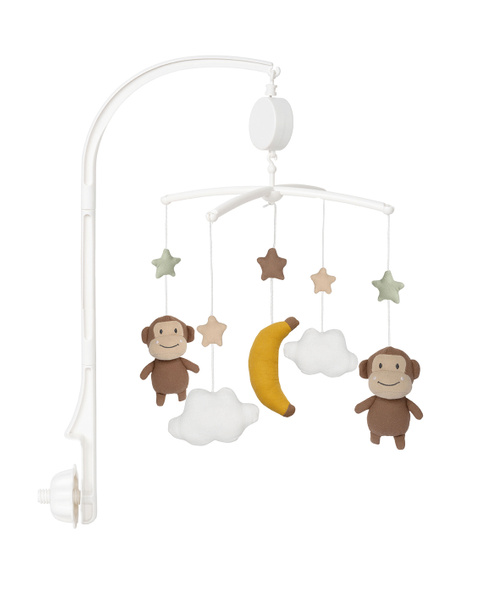 Vytvorte pre svoje bábätko jemné, bezpečné a upokojujúce prostredie s týmto krásnym hudobným kolotočom s roztomilými opičkami. Kolotoč prehráva nežnú melódiu, ktorá pomáha dieťatku uvoľniť sa a ľahšie zaspať. Zavesené opičky, banán a obláčiky sú vyrobené z mäkkých materiálov príjemných na dotyk, vďaka čomu pôsobia hravo a zároveň upokojujúco.